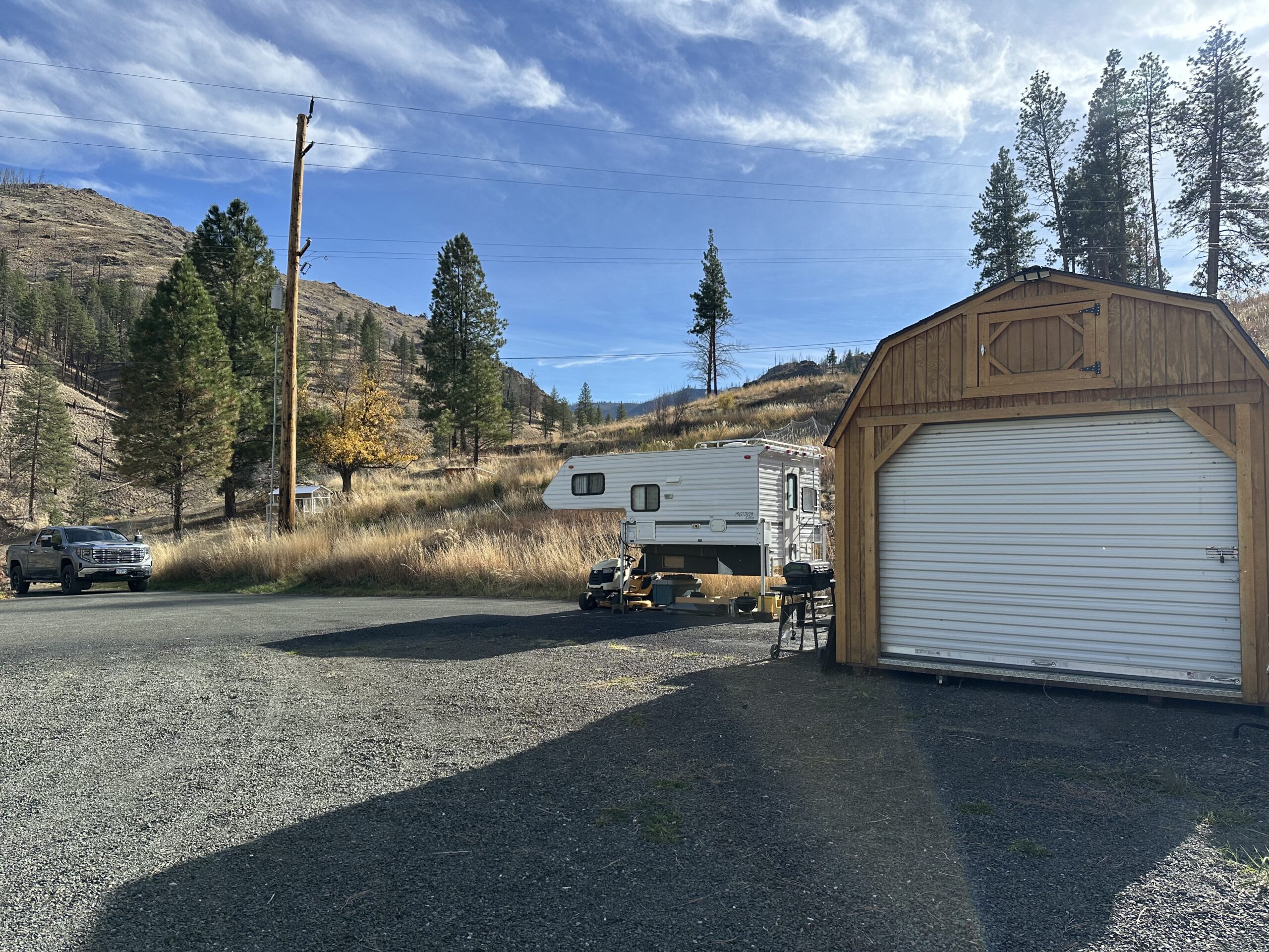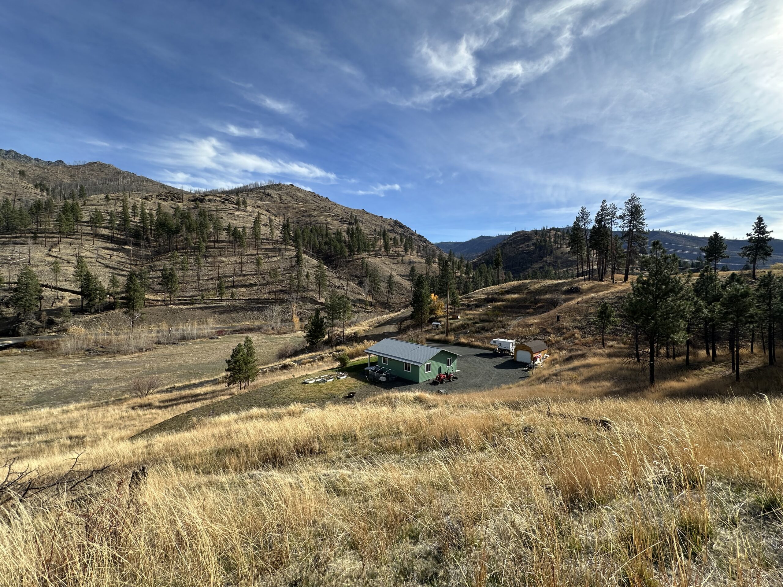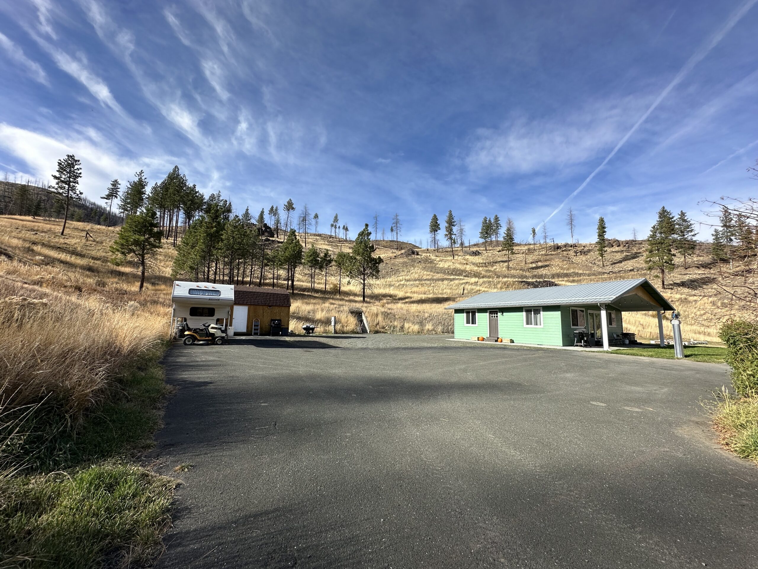This quant home, constructed in 2024, is situated on 21.9 acres and offers stunning views of irrigated pastures and Canyon Creek. Nestled in a private setting, this 900 sq. ft. residence features two bedrooms and one bathroom. The home boasts an open floor plan, a kitchen island, and a spacious pantry with room for a stackable washer and dryer. Thoughtful accents enhance the interior, which includes both laminate and carpet flooring. Recent upgrades include a new well pump, a water softener, and a UV light, with the home being generator-ready. Additionally, there is a full RV hookup equipped with a 50-amp pedestal, as well as dump and water access. The sale includes a charming hickory shed, a hot tub, a dog kennel, and all kitchen appliances. Additional storage is found in a nice block cellar, which houses pressure tank and water filtration.